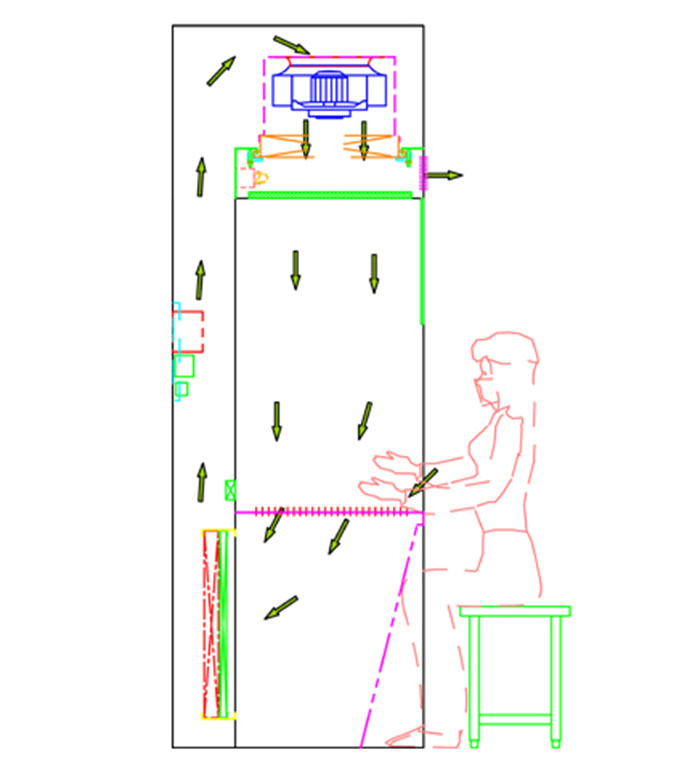 設(shè)備采用垂直單向流的氣流形式,回風(fēng)先通過初效過濾器進(jìn)行預(yù)過濾,將氣流中的大顆粒粉塵粒子處理掉。經(jīng)過預(yù)處理后的空氣,再經(jīng)過高效過濾器進(jìn)行二次過濾,以起到充分保護(hù)高效過濾器的作用。在離心風(fēng)機(jī)提供的壓力下,通過高效過濾器,使之達(dá)到潔凈要求。操作區(qū)與外部環(huán)境的形成相對(duì)負(fù)壓,從而保證此區(qū)域內(nèi)的粉塵不會(huì)擴(kuò)散至室外,起到保護(hù)外部環(huán)境的作用。